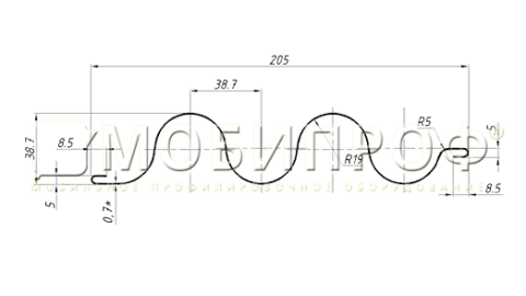 Профилировочный станок Мобипроф ВлнП.R19-39x205.Зв.07 предназначен для производства профиля “Каплеуловитель”, применяемого в промышленных системах кондиционирования. На станке возможно прокатывать холоднокатаную сталь, оцинкованную сталь толщиной 0,7 мм.